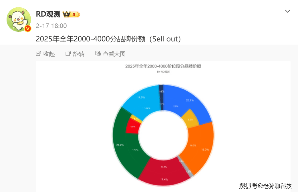博主RD观测公布2025年2000~4000元价位段手机品牌份额分布,本来只是极其正常的数据,没想到遭到“某科技”恶意解读。评价OPPO成为该价位段冠军、vivo销量紧随其后,小米和华为也有不错表现,苹果在该价位段份额“仅有1.3%”。
