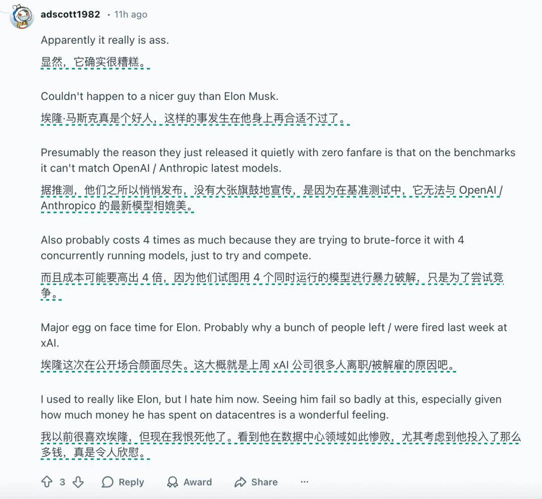 有网友甚至调侃,马斯克所谓的“横扫榜单”可能存在特定的实验室优化环境。Reddit 上有网友猜测,一向高调的马斯克如此低调地发布 Grok 4.2 公测 Beta 版,主要原因还是因为模型能力无法与 OpenAI 和 Anthropice 的最新模型相媲美。