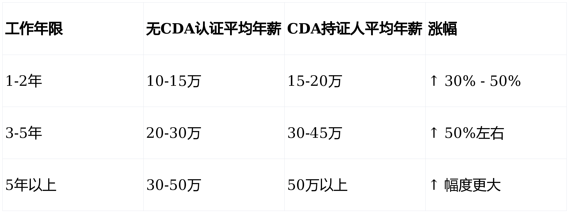 - 持证人薪资水平根据市场调研,CDA持证人的薪资普遍具有竞争力,尤其是在工作3-5年后,薪资涨幅更为显著。以下是一个简单的对比:
