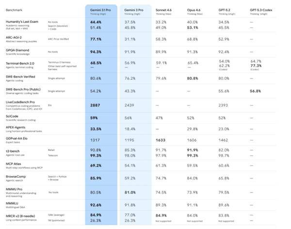 据官方披露,Gemini 3.1 Pro在多项严苛基准测试中表现卓越。以评估逻辑模式处理能力的ARC-AGI-2测试为例,该模型实测成绩达77.1%,推理性能较上一代Gemini 3 Pro提升超一倍。