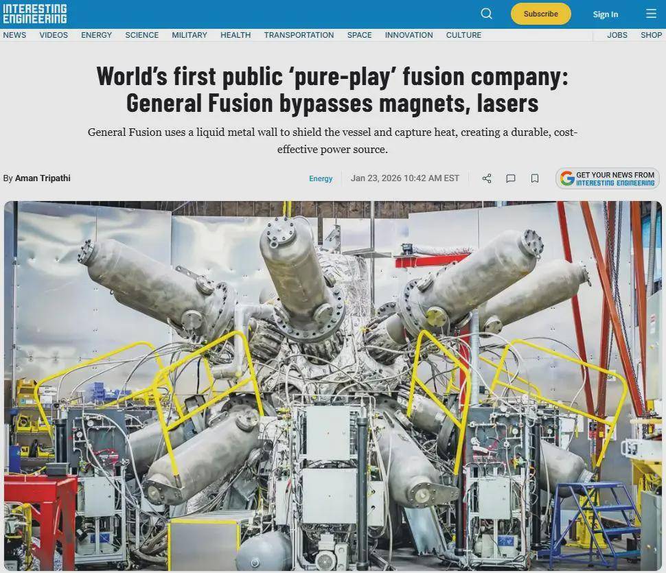 2026年的开年,核聚变赛道就抛出了一枚重磅炸弹。1月22日,加拿大核聚变技术公司General Fusion宣布,将通过SPAC(特殊目的收购公司)模式与Spring Valley Acquisition Corp. III合并,整体估值约10亿美元💵,预计年中完成交割,登陆纳斯达克。这意味着,人类历史上首家纯核聚变上市公司,即将诞生。