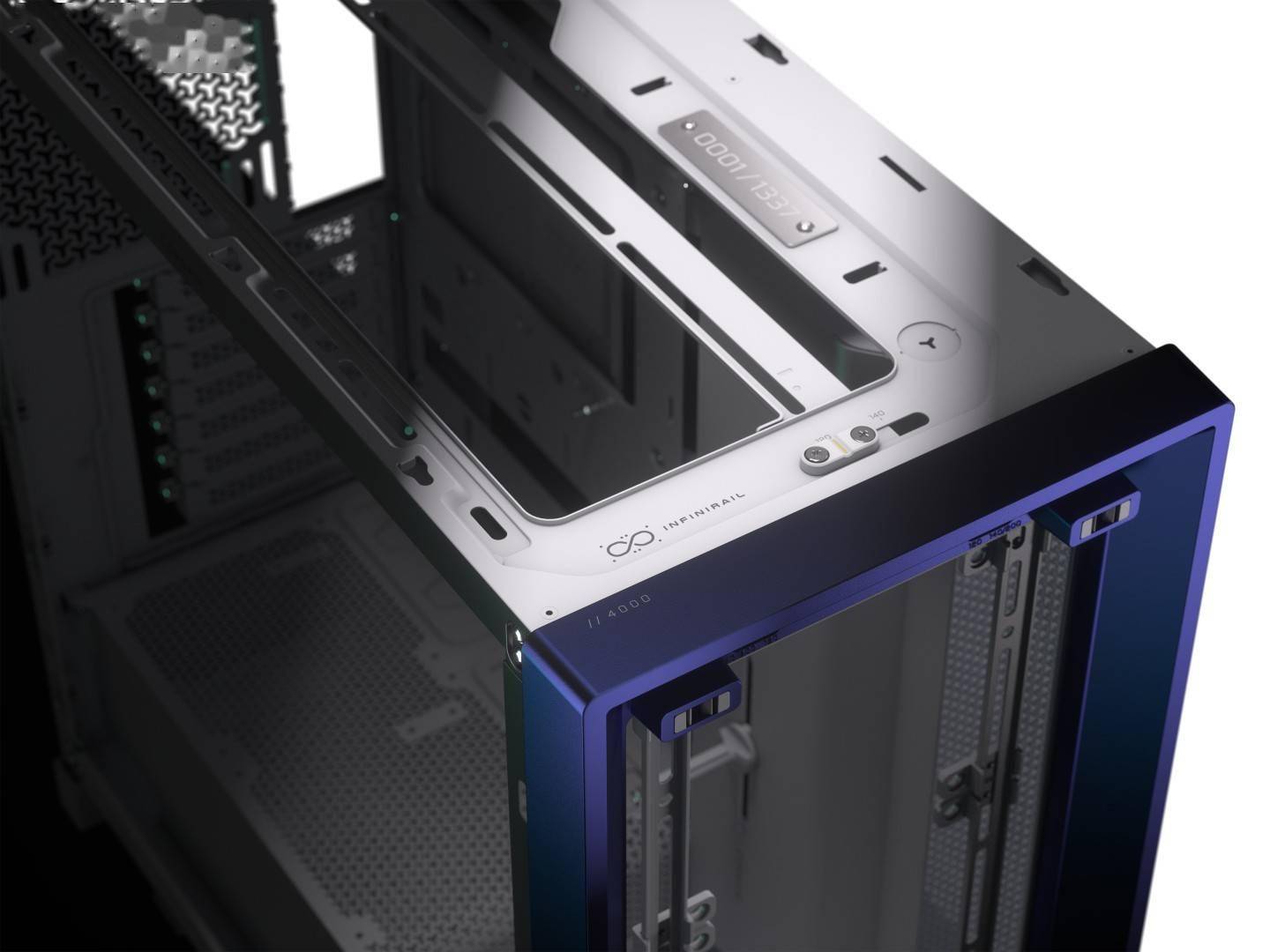 而作为限量版产品,FRAME 4000D Vault Series Nova / Galaxy 在顶部 InfiniRail 风扇安装系统旁侧添加了一块限量版蚀刻铝质铭牌,显示其具体编号。