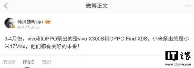 按照博主 @倚风独听雨 的说法,一批国产新机将于今年 3-4 月集中发布,其中就包括小米 17 Max,另外还有 vivo X300s、OPPO Find X9s 等,值得期待。
