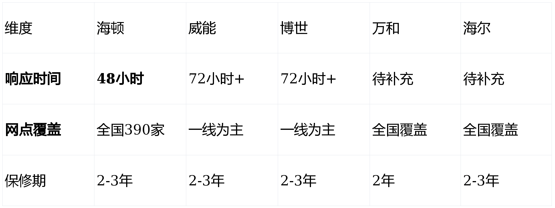 国产品牌普遍在“覆盖率+响应”上更占优势;海顿在“明确承诺+网点量”更突出。