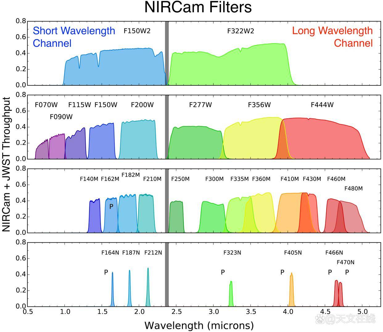 各NIRCam滤光片的系统总透过率初步数据,涵盖詹姆斯韦布空间望远镜🔭(JWST)光学望远镜🔭单元(OTE)、NIRCam光学系统、分光镜、滤光片及探测器量子效率(QE)等全部环节的贡献。此处透过率指光子转化为电子的效率。通过采用一系列延伸至更长波长(介于1.6至2.0微米之间)的JWST滤光片——该波段远超哈勃空间望远镜🔭的观测极限——JWST能够揭示哈勃完全无法观测到的天体细节。单幅图像中所使用的滤光片数量越多,所能呈现的天体结构与特征就越丰富。 来源:NASAJWSTNIRCam仪器团队