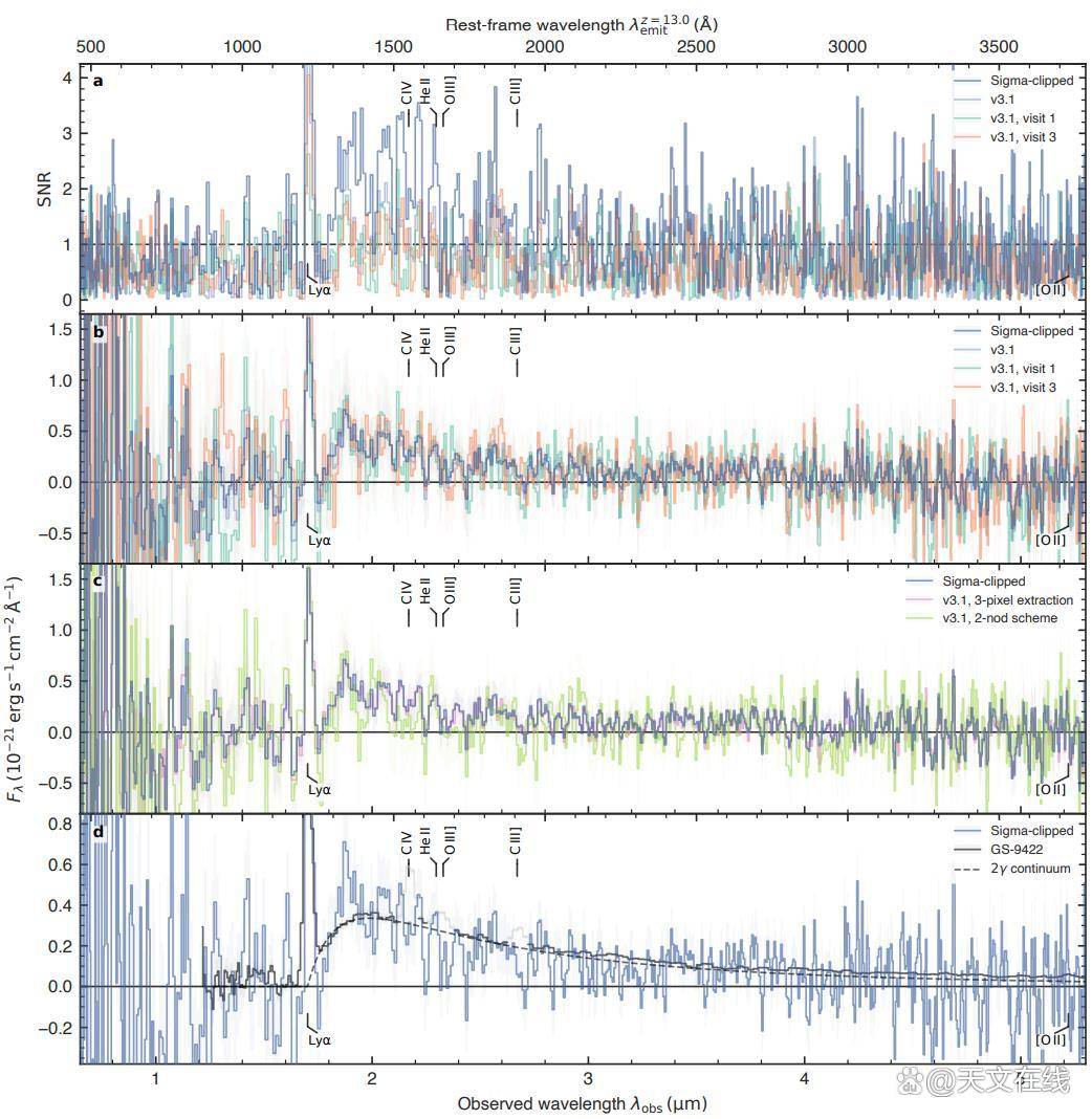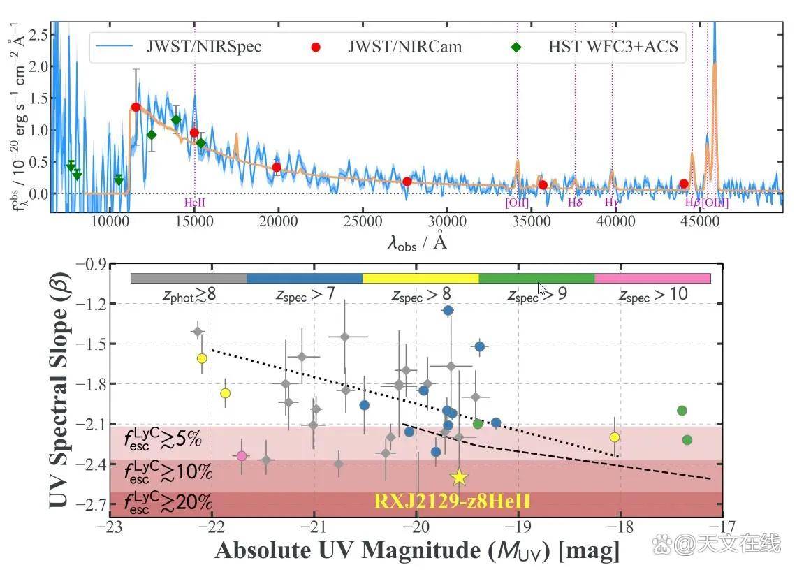 该图展示了星系RXJ2129z8HeII的哈勃望远镜🔭、詹姆斯韦布空间望远镜🔭近红外相机📷️(NIRCam)以及詹姆斯韦布空间望远镜🔭近红外光谱仪(NIRSpec)数据的组合结果。此天体的恒星谱呈现出异常强烈的蓝色倾斜特征,但目前尚无充分证据表明其周围存在原始物质,也难以支持其中含有原始的第三星族(即第一代)恒星的观点。截至目前,尚未发现确凿的第三星族恒星证据。