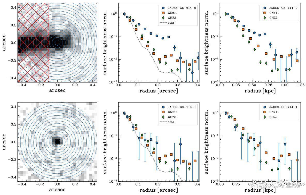 在已知最遥远的星系中,GNz11和GHZ2属于亮度较高的代表,但其物理尺寸却异常致密;而JADESGSz141则更典型地表现为高亮度且空间延展性较强,据此推断其物理尺度约为1700光年。
