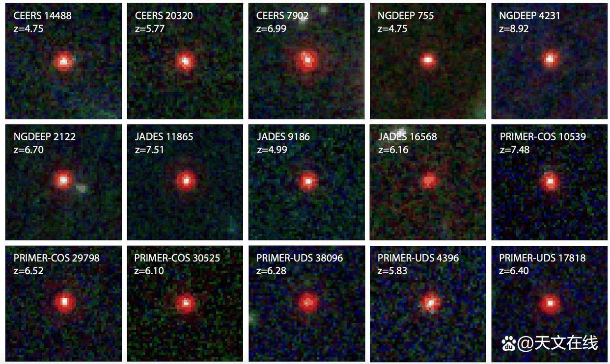 这张图像展示了詹姆斯韦布空间望远镜🔭(JWST)迄今在遥远宇宙中发现的341个小红点星系中的15个。这些星系均展现出相似的特征,但仅存在于宇宙早期;目前尚未在近邻宇宙或宇宙晚期发现此类星系。它们普遍具有较大质量,其中部分星系结构致密,另一些则较为延展;部分星系表现出活动星系核(AGN)活动迹象,而其余则未观测到此类现象。