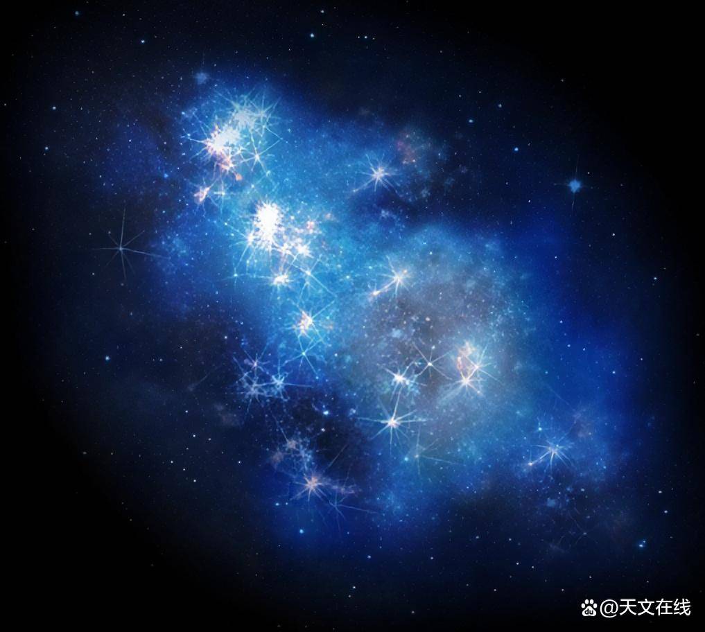 一幅艺术家对宇宙中某区域首次形成恒星时可能景象的构想。随着恒星发光、吸积物质并收缩,会释放出电磁辐射☢️和引力辐射☢️。在恒星内部,气体压力与引力相抗衡,支撑着各层结构以抵抗引力坍缩。恒星形成区域周围是一片黑暗,因为中性原子有效地吸收了所发出的星光,而恒星发出的紫外光则从内部开始逐渐电离周围的物质。 图片来源:PabloCarlosBudassiWikimediaCommons