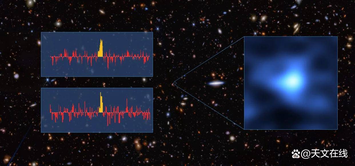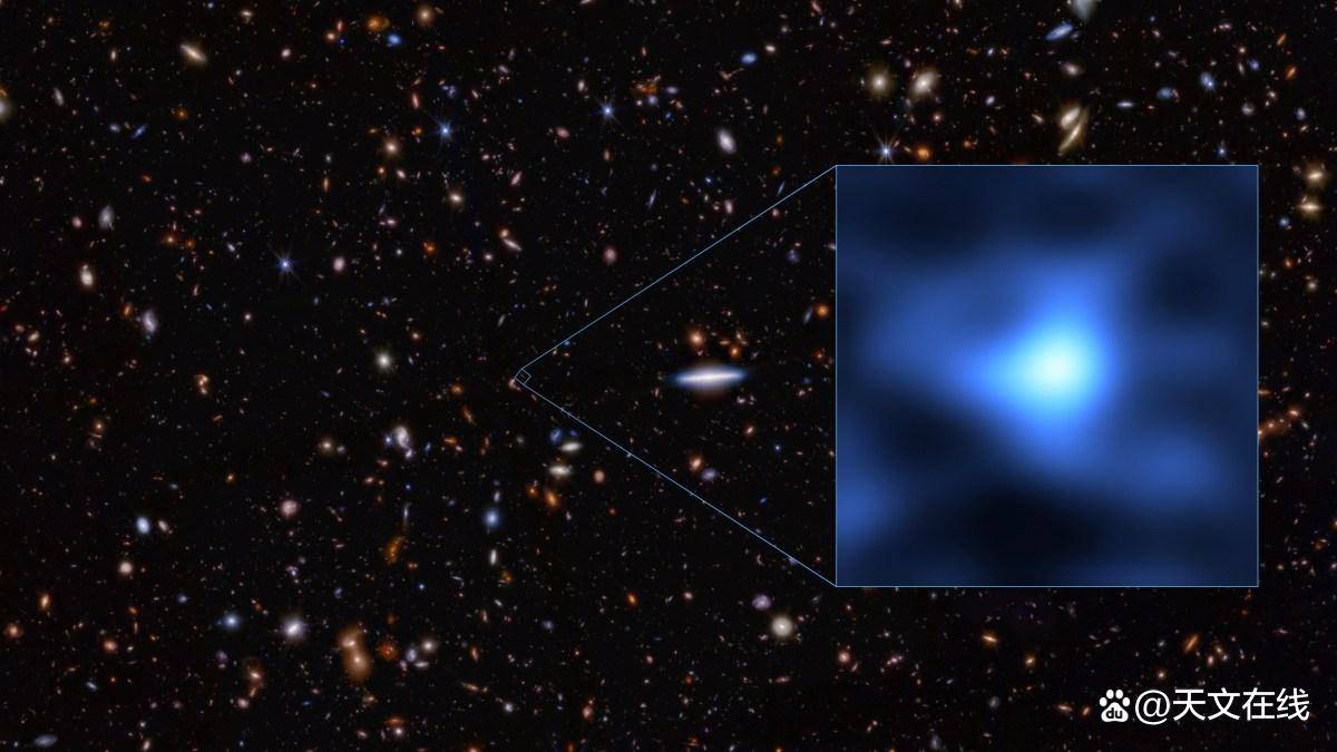 星系JADESGSz140的图像由詹姆斯韦布空间望远镜🔭(背景)和阿塔卡马大型毫米亚毫米波阵(ALMA,插图)联合获取。该星系光谱中探测到明确的氧元素特征谱线,这一结果由两个独立团队利用ALMA对该星系开展观测后分别确认。氧元素的确认存在,标志着迄今在宇宙中所发现的最早期氧元素。 图片来源:美国国家航空航天局(NASA)、欧洲航天局(ESA)、加拿大航天局(CSA)、太空望远镜🔭科学研究所(STScI)、加州大学圣克鲁兹分校布兰特罗伯逊(BrantRobertson)、哈佛史密松天体物理中心本约翰逊(BenJohnson)、剑桥大学桑德罗塔切拉(SandroTacchella)、哈佛史密松天体物理中心菲尔卡尔吉尔(PhillCargile)