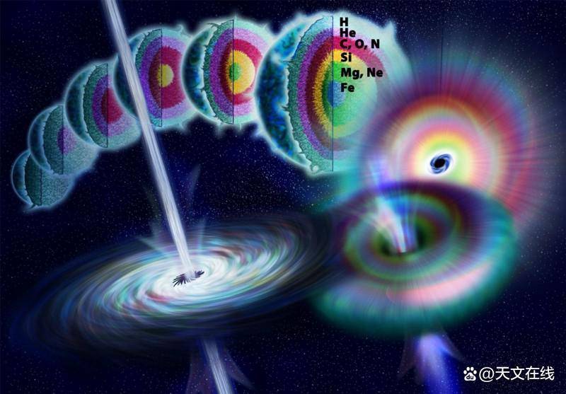 一颗质量极大的恒星在其整个生命历程中的结构演化,最终以II型(核心坍缩型)超新星爆发告终——当其核心耗尽核燃料时即发生该爆发。核聚变的最后阶段通常是硅燃烧,仅在极短时间内于核心中生成铁及类铁元素,随后便迅速触发超新星爆发。质量最大的恒星经历核心坍缩超新星的过程最短,通常形成黑洞;而质量相对较小的恒星则演化时间较长,最终只形成中子星。 来源:NicolleRagerFuller/美国国家科学基金会