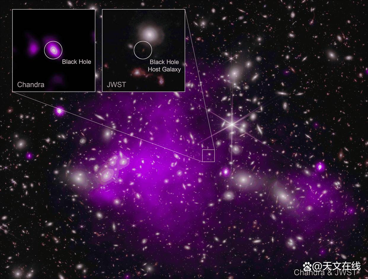 一个位于詹姆斯韦布空间望远镜🔭(JWST)拍摄的阿贝尔2744星系团(又称潘多拉星系团)背景中的遥远星系,发出强烈的X射线🩻辐射☢️,其特征与一个质量介于1000万至1亿倍太阳质量之间的黑洞相符。该星系自身的恒星总质量仅与此相当,因此成为揭示早期宇宙中黑洞与星系协同演化关系的首个关键例证。 图片来源:NASACXCSAOÁkosBogdán;红外图像来源:NASACXCSAOL.Frattare与K.Arcand