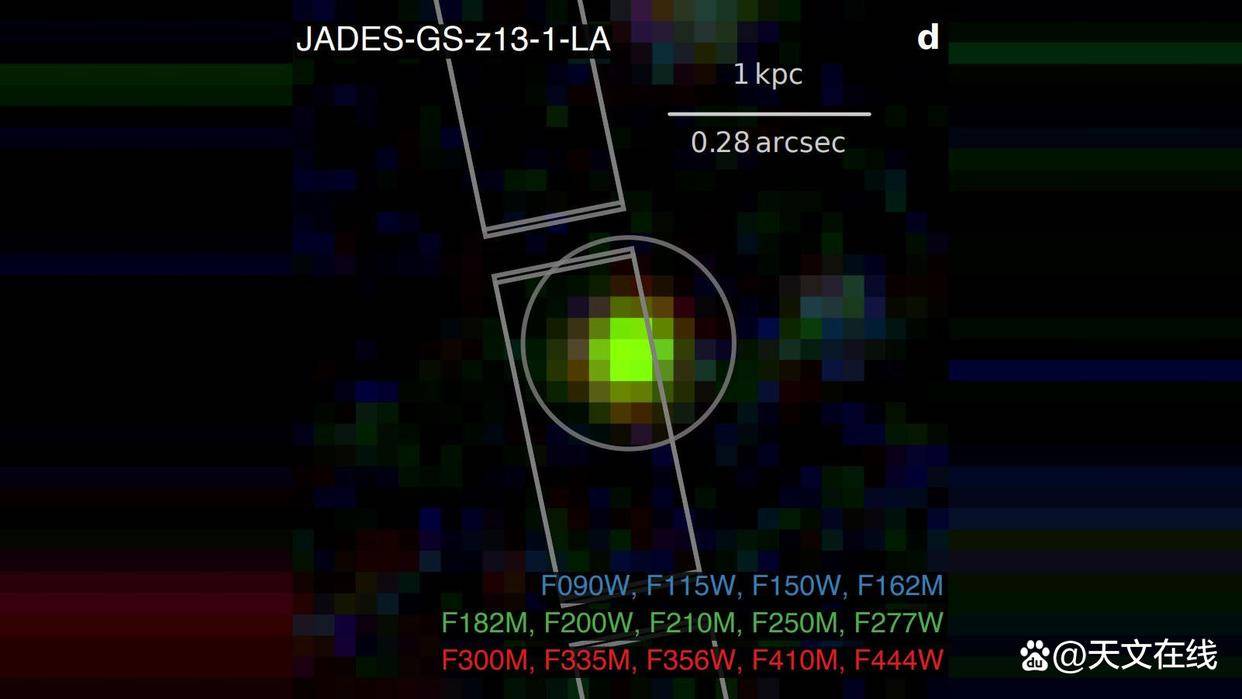 这张由韦布空间望远镜🔭(JWST)近红外相机📷️(NIRCam)多种测光滤光片获取的测光图像,呈现了星系JADESGSz131LA。该星系非常明亮,但在波长低于约1.7微米的波段中未探测到任何辐射☢️信号。星际介质对这一较短波长的光具有极强的吸收能力,然而该星系却展现出一条明亮且未被遮蔽的氢发射线,这一现象目前仍令天文学家感到困惑。