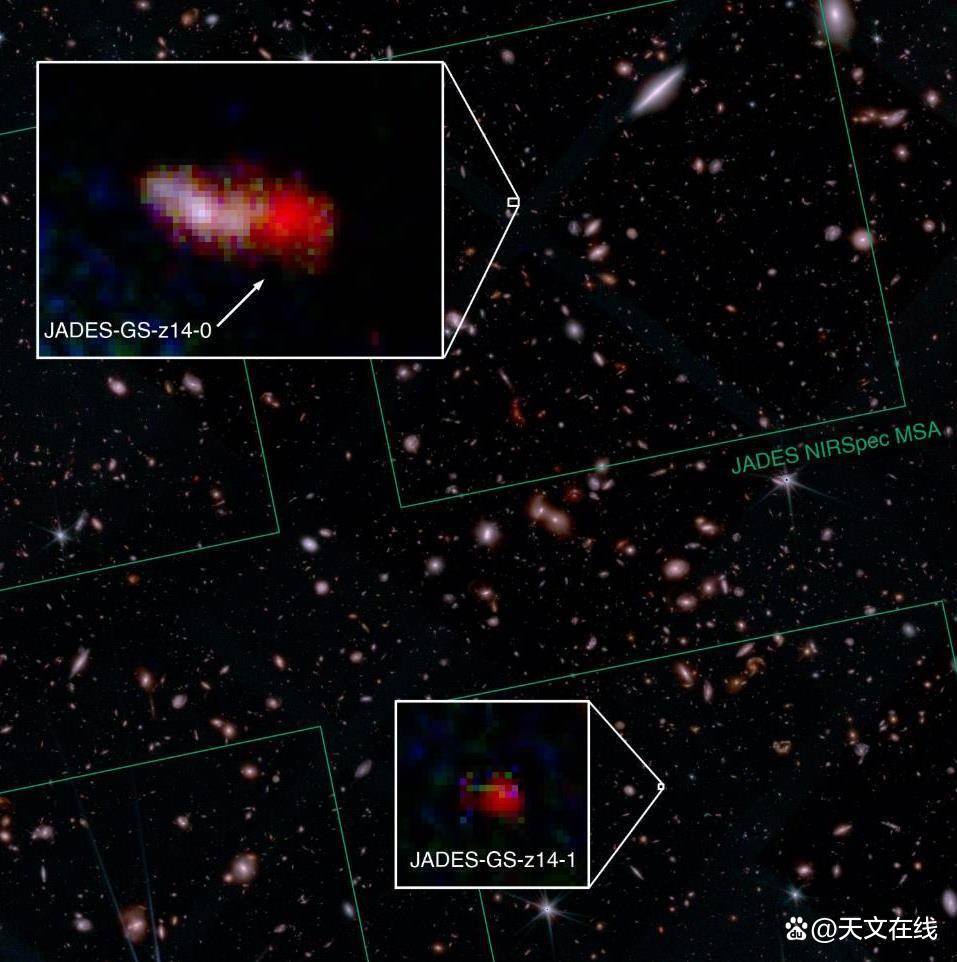 JADESGSz140位于顶部小插图框内,处于一个距离更近、更明亮、颜色更偏蓝的星系后方(且略微偏右)。正是凭借詹姆斯韦布空间望远镜🔭(JWST)强大的光谱分辨能力,才得以将这两个天体清晰分离,从而确认了这一创纪录遥远天体的本质。它发出的光抵达我们时,宇宙年龄仅为约2.85亿至2.9亿年,仅相当于当前宇宙年龄的2.1%。位于其正下方的JADESGSz141,则来自宇宙年龄约为3亿年的时期。与当今大型星系相比,所有早期星系恒星数量都较少,且形态不规则、边界模糊。