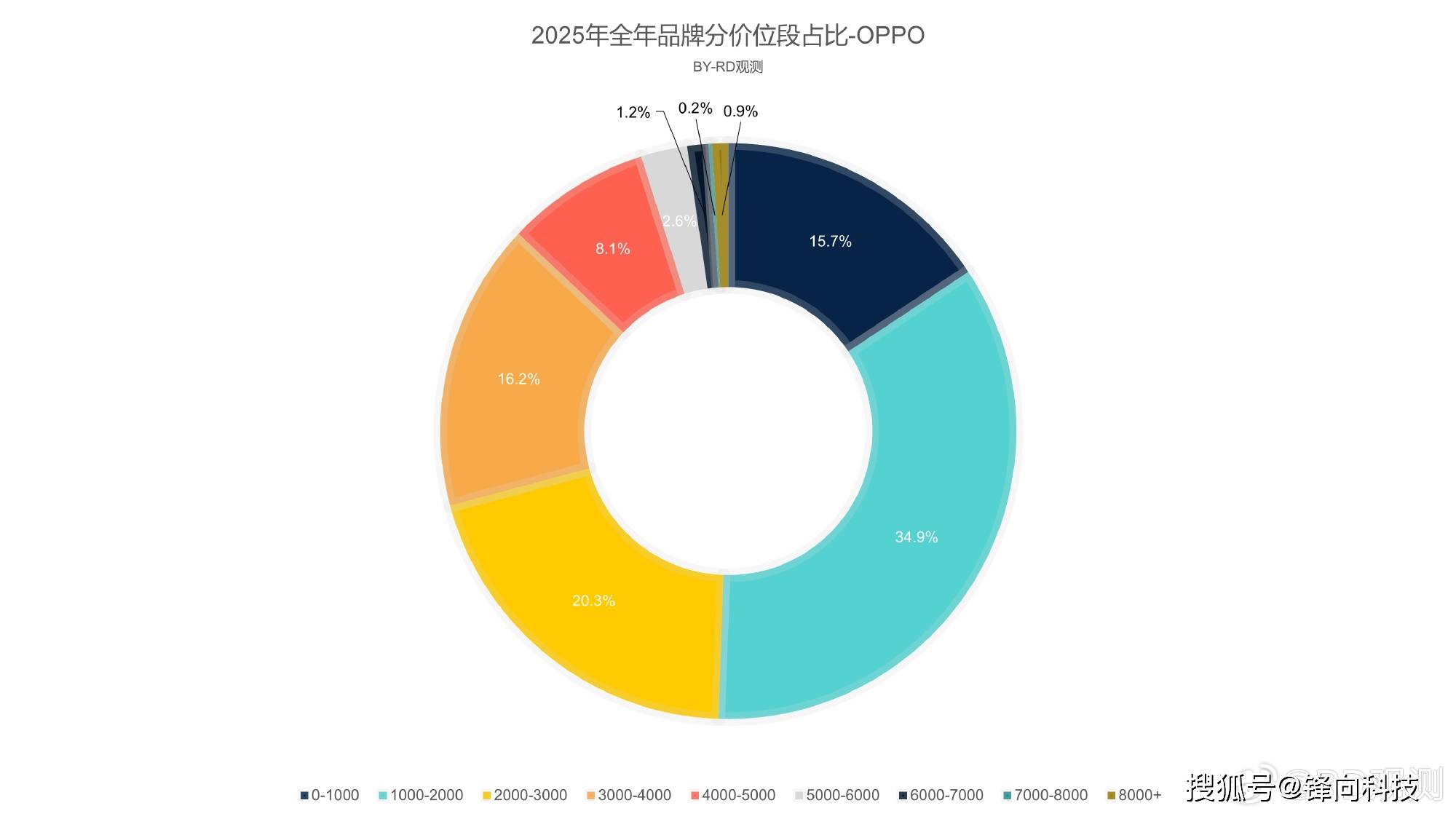 在分析之前先讲明一下,这个OPPO是纯纯的OPPO,是不包括一加与realme的。来自行业人士“RD观测”的数据显示,在2025年度售价0-1000元的机型在OPPO总销量的15.7%,售价1000-2000元机型占OPPO总销量的34.9%;售价2000-3000元机型占OPPO总销量的20.3%;售价3000-4000元机型占OPPO总销量的16.2%;售价4000-5000元机型占OPPO总销量的8.1%;售价5000-6000元机型占OPPO总销量的2.6%;售价6000-7000元机型占OPPO总销量的1.2%;售价7000-8000元占OPPO总销量的0.2%;售价8000元以上机型占OPPO总销量的0.9%。