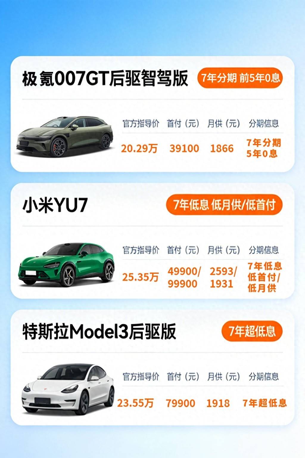 最后个人最看好的是极氪007GT、新款小米SU7、Model3这三款