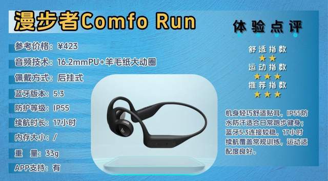 Comfo Run属于漫步者在开放式运动耳机里的舒适取向款,主打轻量佩戴和长续航,更偏向日常运动与通勤兼顾的人群,不走极限户外路线。