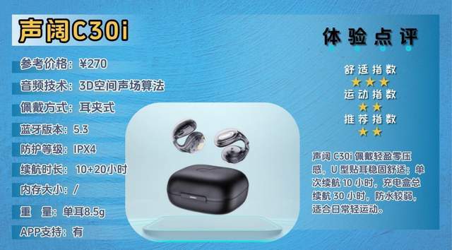 声阔C30i主打超轻盈佩戴体验,整体设计偏向日常舒适和轻运动使用,强调零压感和长时间佩戴的舒适性,让你在办公、通勤或者轻跑时都能无感佩戴。U型贴耳结构结合可拆卸耳翼,贴合耳廓,稳固性不错,同时外观简洁、时尚,适合年轻用户或追求轻便舒适的日常佩戴者。
