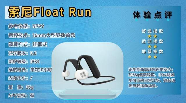 Float Run是索尼在开放式耳机里的轻运动/日常使用取向款,更强调环境感知与佩戴舒适度,定位并不是专业运动,而是运动、通勤、办公都能兼顾的轻量选择。