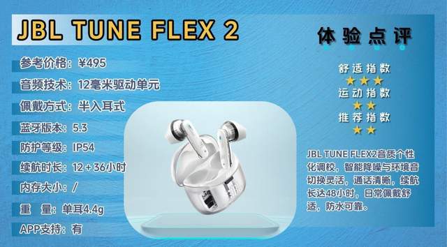 JBL TUNE FLEX2面向日常通勤、办公室及轻度运动用户,主打个性化音效和智能降噪,强调佩戴舒适与音质优化。