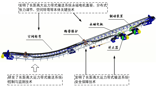 该项目通过自主创新突破了制约矿山长距离大运力带式输送系统本体关键技术、状态监测技术和安全保障技术等共性难题,实现了大型带式输送系统的国产化。主要技术内容如下: