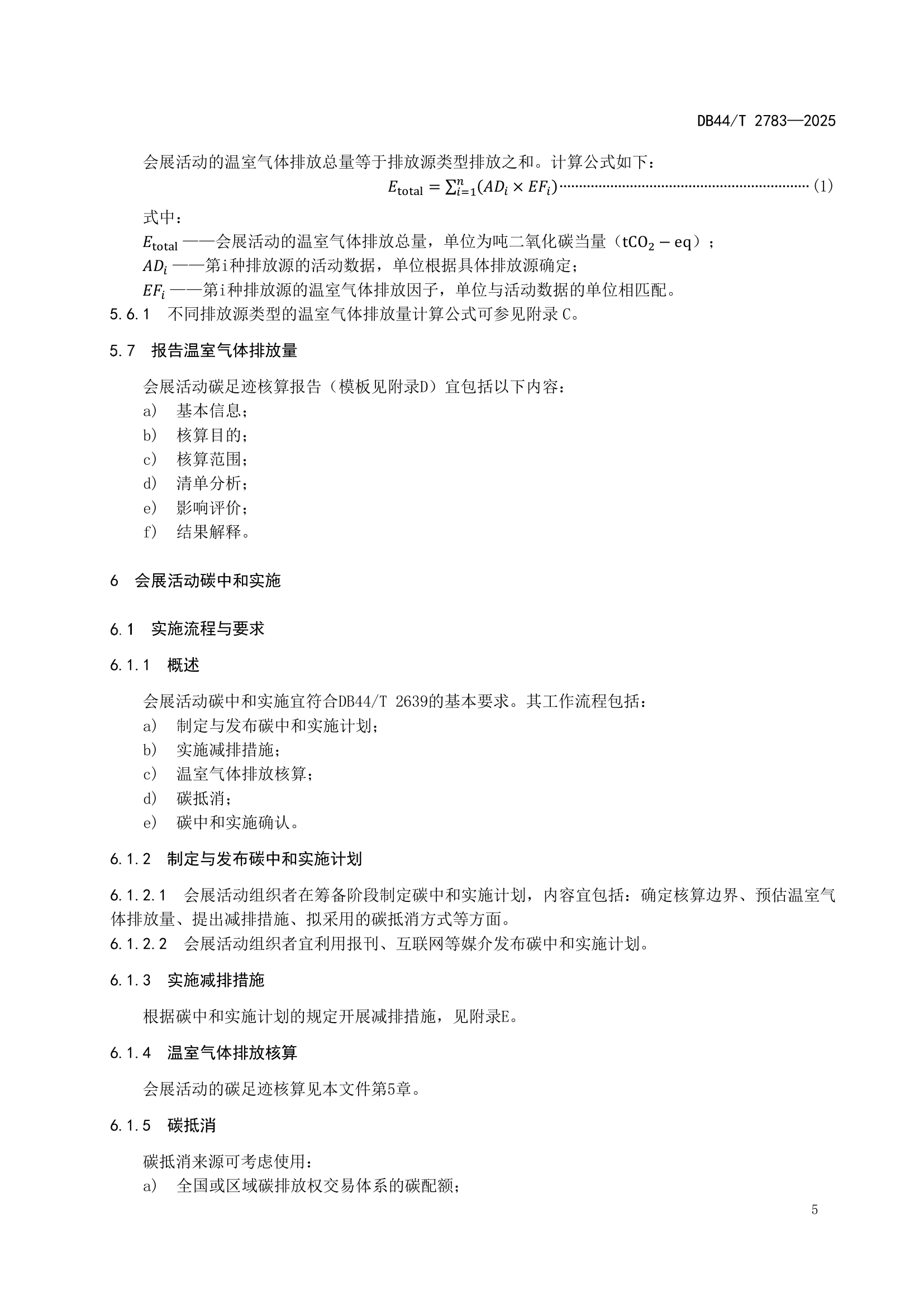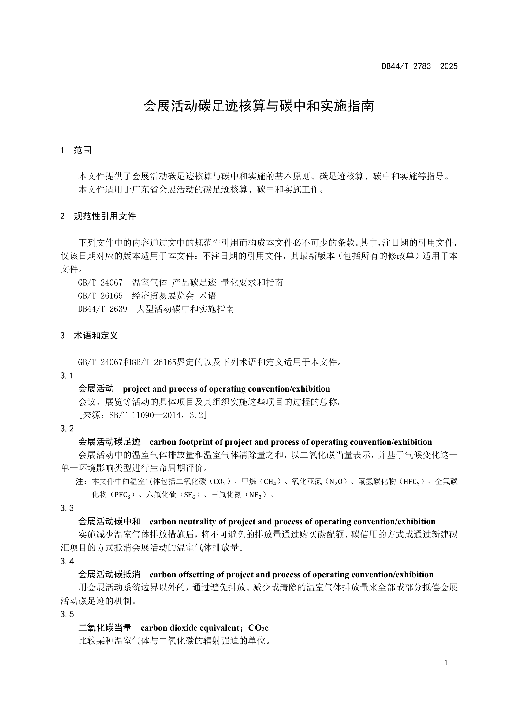 本文件明确了会展活动碳足迹的核算方法与碳中和实施路径,适用于会展活动全过程的碳管理。标准涵盖碳足迹核算的基本原则、数据收集方式、排放因子推荐值、核算方法及报告模板等内容。要求对会展活动各阶段的温室气体排放进行量化分析,明确界定碳足迹计算范围,并提出减排措施与碳抵消机制。通过系统性数据采集与科学核算,实现对会展活动碳排放的全面掌握,为碳中和目标提供依据。文件还提供了具体操作指南,包括活动数据记录、排放因子选择、核算流程及碳中和方案设计,旨在推动会展行业绿色低碳发展。