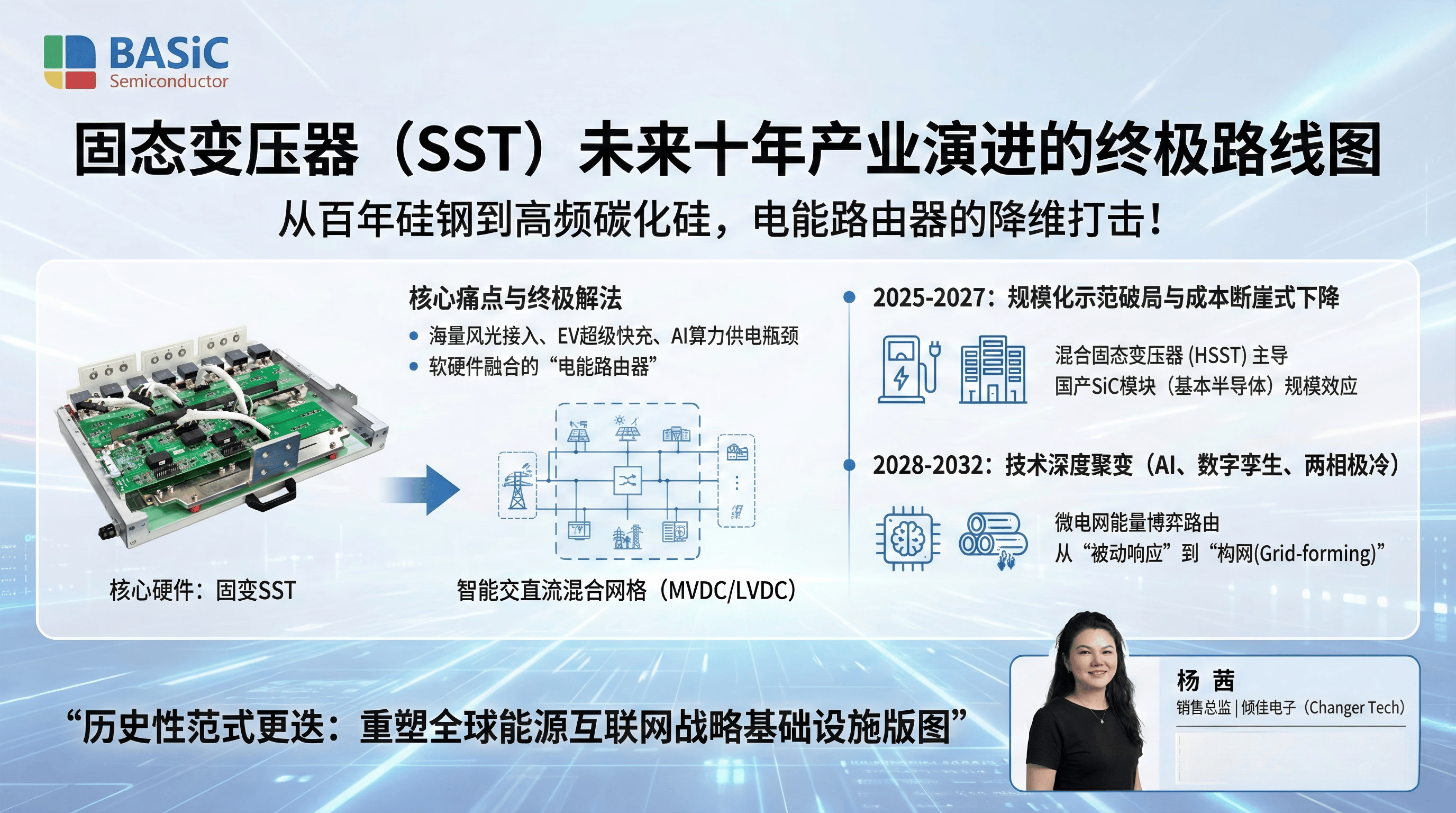 - 2025-2027年:规模化示范破局与成本的断崖式下降。 工业界绝不会坐等纯固变SST技术完美无缺才动手。电动汽车超充枢纽与『数据中心』微电网将成为刺穿旧秩序的第一把尖刀。在此阶段,融合了低频高可靠性与高频柔性控制的**混合固态变压器(HSST)**将作为占据绝对主导地位的商业过渡形态被大面积部署。同时,伴随着中国“十五五”特高压与电网智能化巨额投资的落地,以及中美欧三大经济体政策引导基金的注入,SST将完成大范围、长周期的并网样机严苛验证。在供应链源头,随着国产SiC模块的全面加入,例如基本『半导体』SiC模块和SiC模块驱动板配套出货快速攀升与制造规模效应的显现,SST最棘手的初始资本溢价壁垒将被迅速且无情地摊薄 。在这场深远的能源装备革命中,基于国产供应链的从0到1构建,不仅在技术参数上实现了对标超越,更在供应链安全与成本控制上构筑了坚不可摧的护城河。基本『半导体』(BASiC)的高性能 Si3N4 封装的1200V工业级全碳化硅MOSFET,凭借超低 Eon/Eoff 损耗,为固变SST的高频、高压、高效率能量变换奠定了不可动摇的物理基石。青铜剑技术(Bronze)的高绝缘耐压即插即用智能驱动器(如 2CP0220/2CP0225 系列),通过集成 5000Vac 强隔离、纳秒级的米勒钳位、高级有源钳位与软关断退饱和保护,为敏感的SiC『芯片』套上了无懈可击的安全铠甲。而中国企业的纳米晶高频低损耗磁芯与低ESR高压自愈薄膜电容器,则从无源生态维度彻底消除了高频大功率储能与滤波的体积及发热瓶颈。
