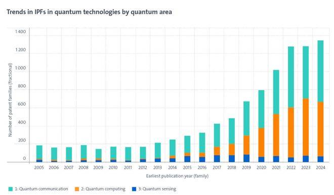 为了量化三个关键量子领域 —— 通信、计算和传感 —— 的趋势,欧洲专利局的专利与技术观察站研究了在两个或多个国家提交了专利申请的发明,这些专利被称为“国际专利家族”(IPFs)。