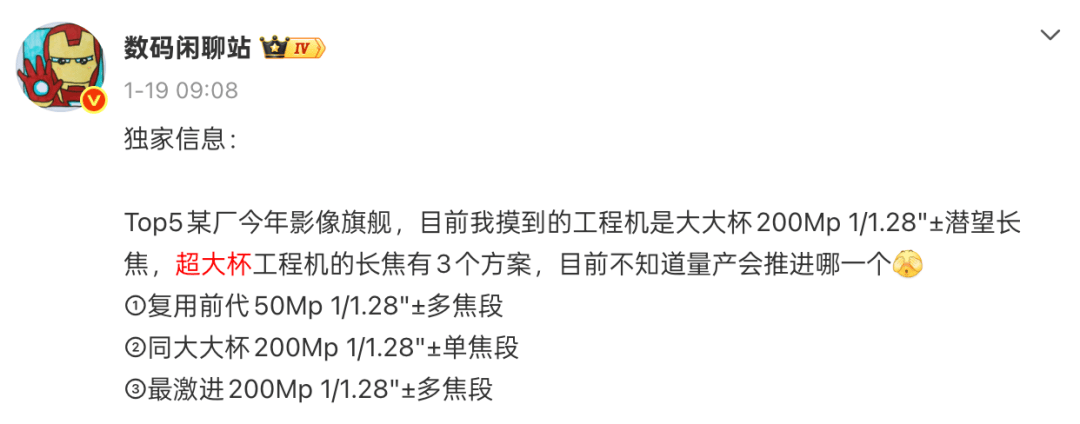 不过其他机型的主摄有点摇摆,最开始除了标准版都给到1英寸,结果过了一个月,内部又觉得1英寸收益不大,还可能面临国产CMOS产能问题,考虑回退到1/1.28英寸。