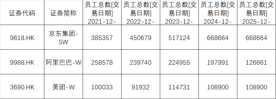 其中,阿里自2022年起便进入员工收缩阶段,2025年卖出大润发和银泰百货后,员工人数从2024年的19.79万人缩减至12.6万人,一年之内减少7.13万人;而2022年至2024年,阿里的员工减少数量分别为1.88万人、1.47万人和2.69万人,收缩幅度逐年加大。
