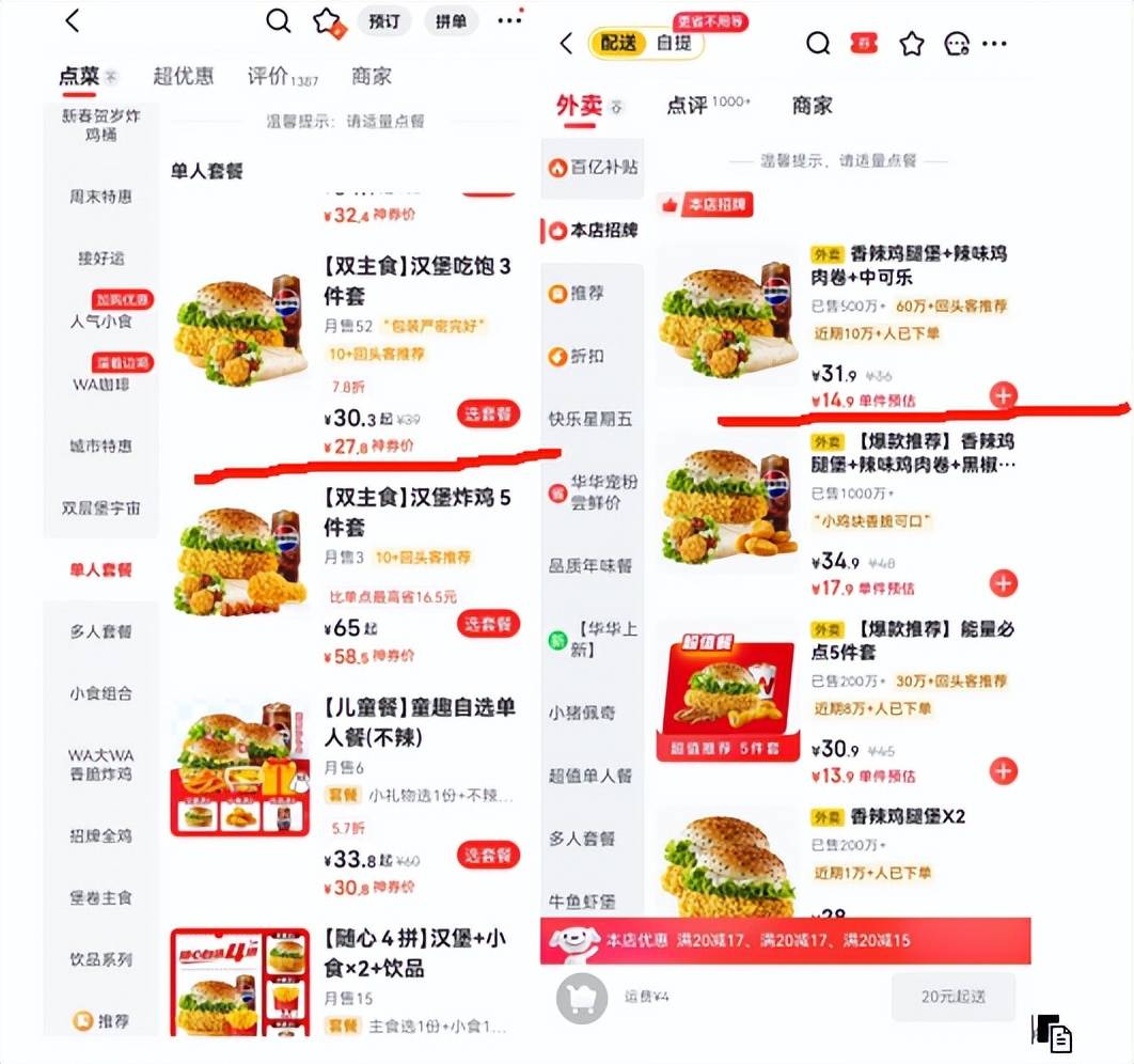 例如华莱士同款汉堡套餐,京东仅售14.9元,而美团为27.8元,即便叠加神券优惠后也只能降至22.3元,依旧比京东高出近50%;