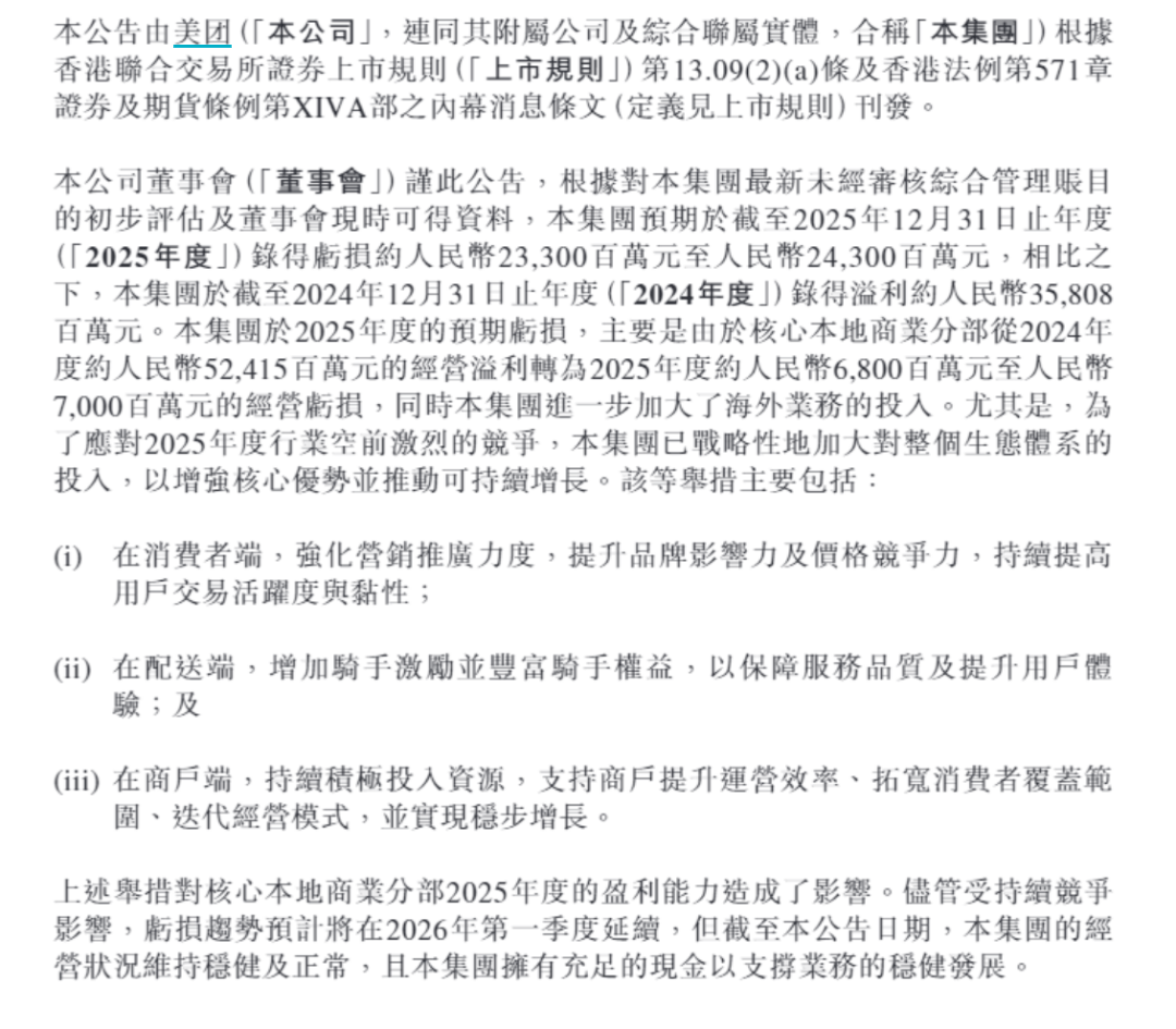 即便如此,美团也没能给出一个乐观的预期。公告明确表示,受持续竞争的影响,亏损趋势预计将在2026年第一季度延续。