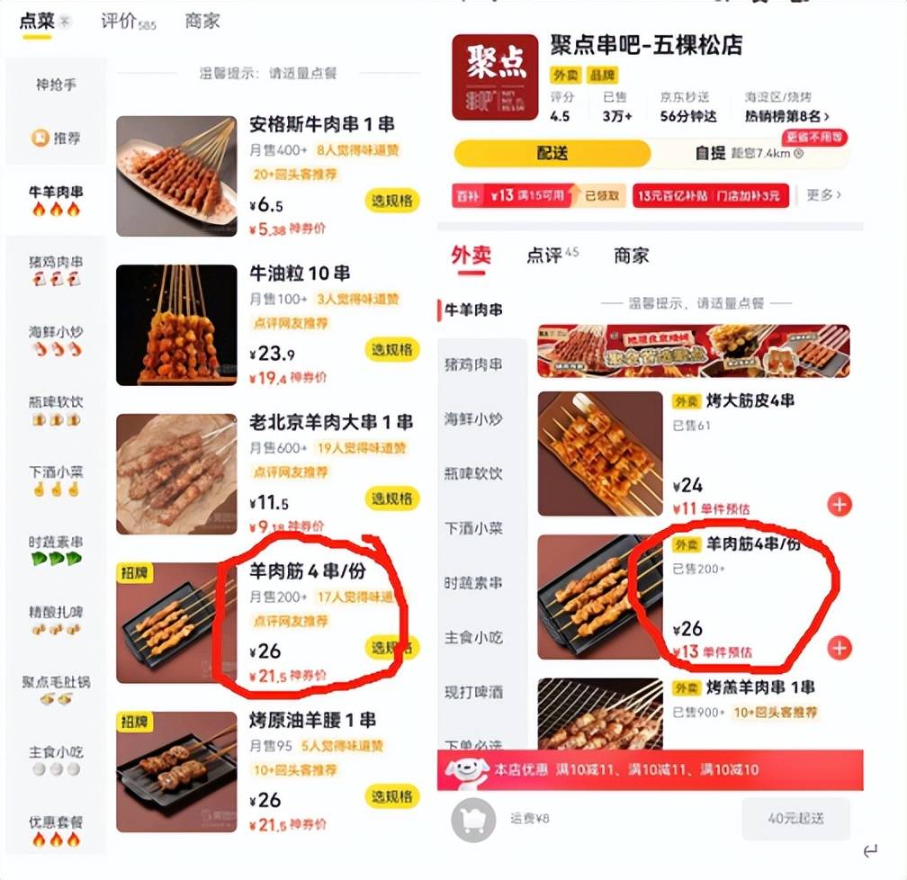 另一家连锁品牌聚点,同款羊肉筋,京东券后价13元4串,美团券后价21.5元,美团价格依旧高出不少。