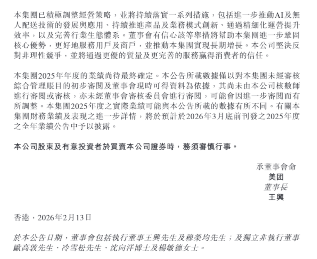 2026年2月13日,美团发布盈利预警公告,预计2025年度净亏损约233亿元至243亿元。