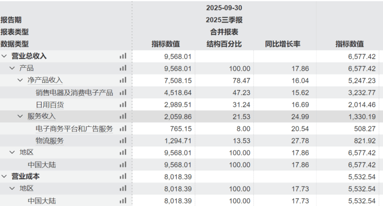 阿里同样受到行业环境影响,前三季度营业收入同比增速不足6%,相较于2024年下降2个百分点;而京东则实现逆势高增长,2025年前三季度营业收入同比增长17.86%,相较于2024年的6.84%大幅提升。