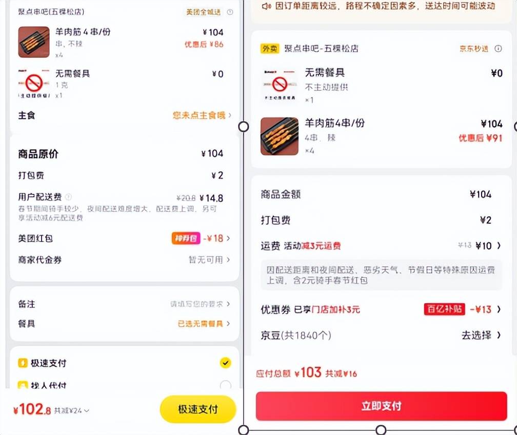 不过也有例外:笔者手中持有一张美团18元红包🧧,尝试点购4份羊肉筋后,最终总价为102.8元,比京东同数量订单便宜0.2元,这一轮,美团勉强实现小幅反超。但这显然无法弥补整体差距。