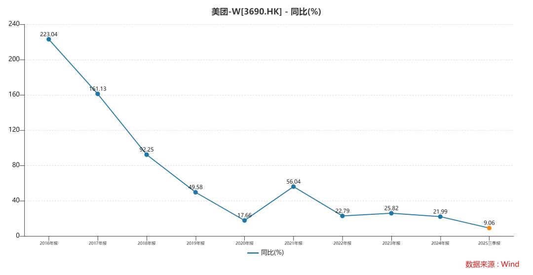 2025年前三季度,美团营业收入同比增长9.06%。回顾往年数据,美团前三季度营业收入同比增长率多数高于全年增长率,据此推测,2025年全年营业收入同比增长率有不小的概率低于9%,这一增速几乎创下近10年最低纪录,增长动力明显不足。