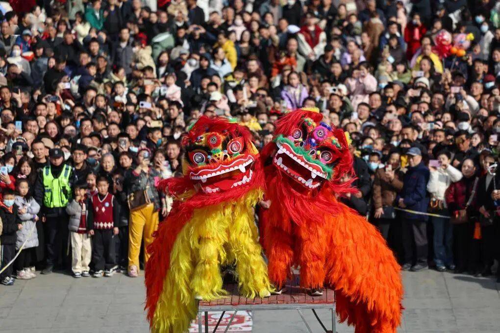 2月18日,人们在甘肃省兰州市七里河区兰州老街观看舞狮表演。今日霍州发(侯崇慧摄)