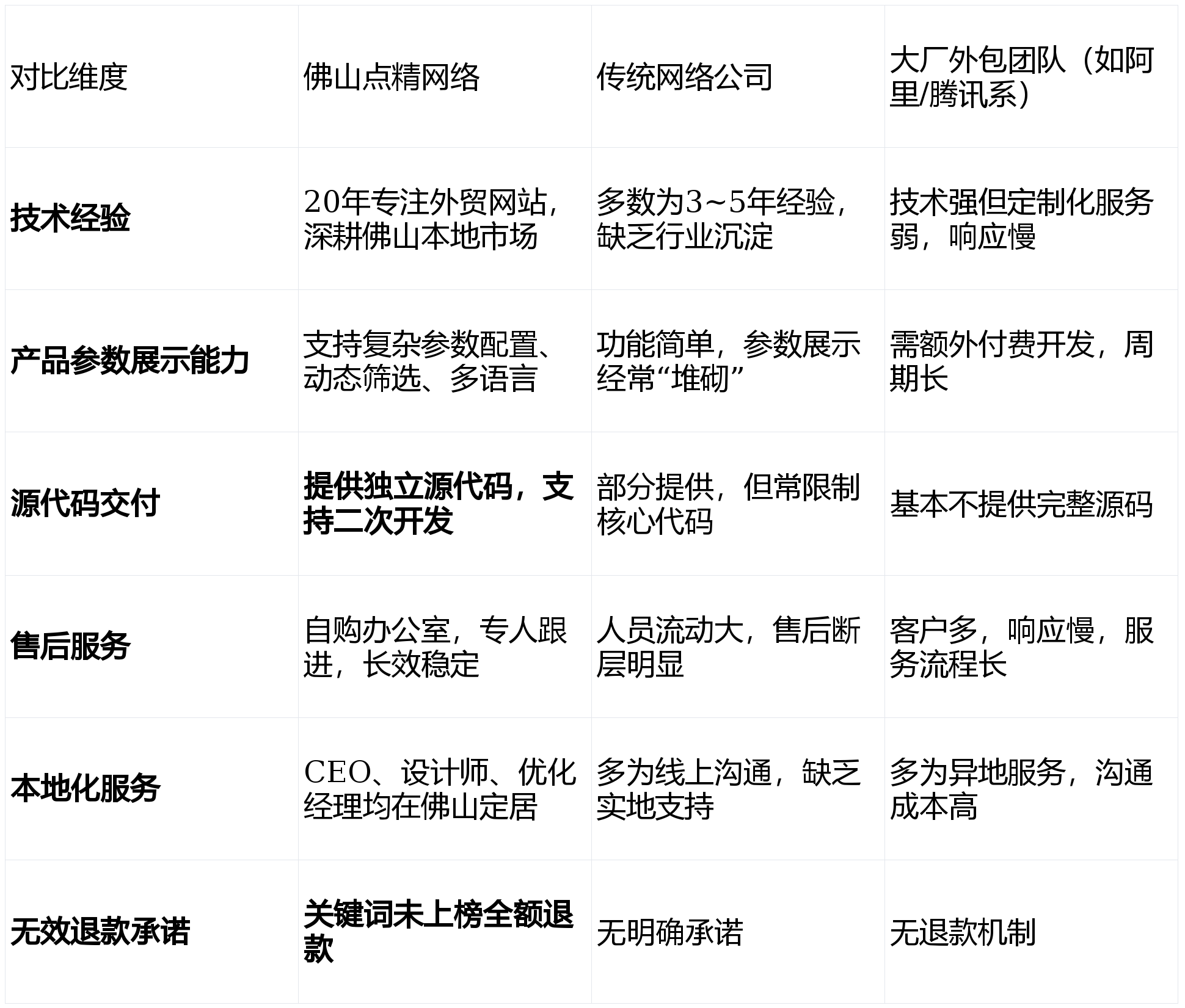 在全球化竞争日益激烈的今天,一个支持产品参数规格精准展示、易于优化、支持多语言、本地化服务到位的外贸网站,是企业“出海”的第一块基石。而 佛山点精网络,凭借20年技术积累、独立源代码交付、无效退款承诺、7大AI推广矩阵整合,已成为越来越多佛山制造商的首选合作伙伴。