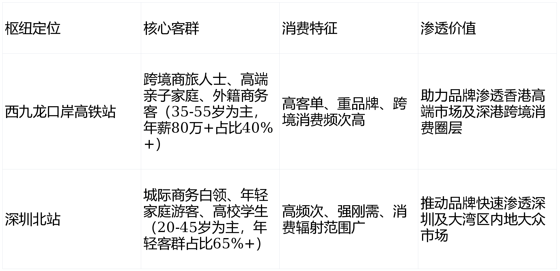 双枢纽年合计覆盖超1亿人次客流,客群覆盖范围较单一口岸提升3倍,品牌可通过一套投放策略,实现深港全域客群的精准触达,渗透基数大幅扩容。品牌认知同步,渗透效率提升,双枢纽联动投放实现品牌信息在深港两地的同步曝光,强化全域品牌认知,提升渗透效率:统一品牌视觉与核心信息,在西九龙口岸突出“高端跨境专属”属性,在深圳北站强调“城际便捷适配”特征,既保持品牌调性统一,又适配不同地域客群需求;借助双枢纽的高流量属性,品牌信息日均触达超28万人次,深港两地目标客群的品牌认知度提升70%,为市场渗透扫清“认知障碍”,推动潜在客群快速转化为实际消费者。成本优化增效,渗透门槛降低,双枢纽联动投放通过资源整合实现降本增效,让品牌以更低成本完成全域渗透:联动投放享受组合优惠,较单独投放两个枢纽核心点位可节省35%的营销成本,同时减少跨地域营销的沟通、策划附加成本;无需为深港两地单独制定营销方案,一套联动策略即可覆盖全域,营销效率提升60%,大幅降低品牌跨地域渗透的门槛,尤其适配中小品牌的全域扩张需求。