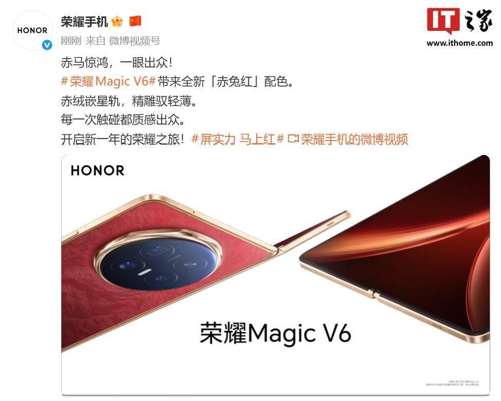 今日霍州 2 月 24 日消息,荣耀官方刚刚公布了 Magic V6 『折叠屏手机』的外观,并官宣了新机的全新配色 ——「赤兔红」。