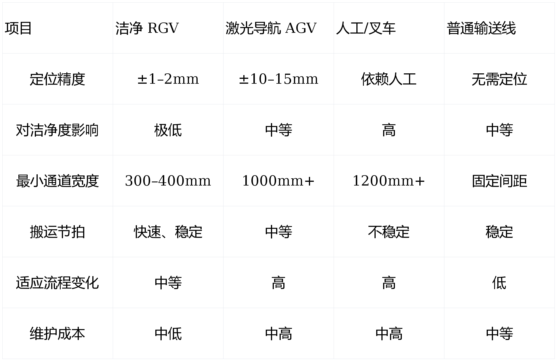 与 AGV、人工、输送线的对比分析为便于设备选型,下方表格展示洁净车间常见搬运方式的关键指标对比: