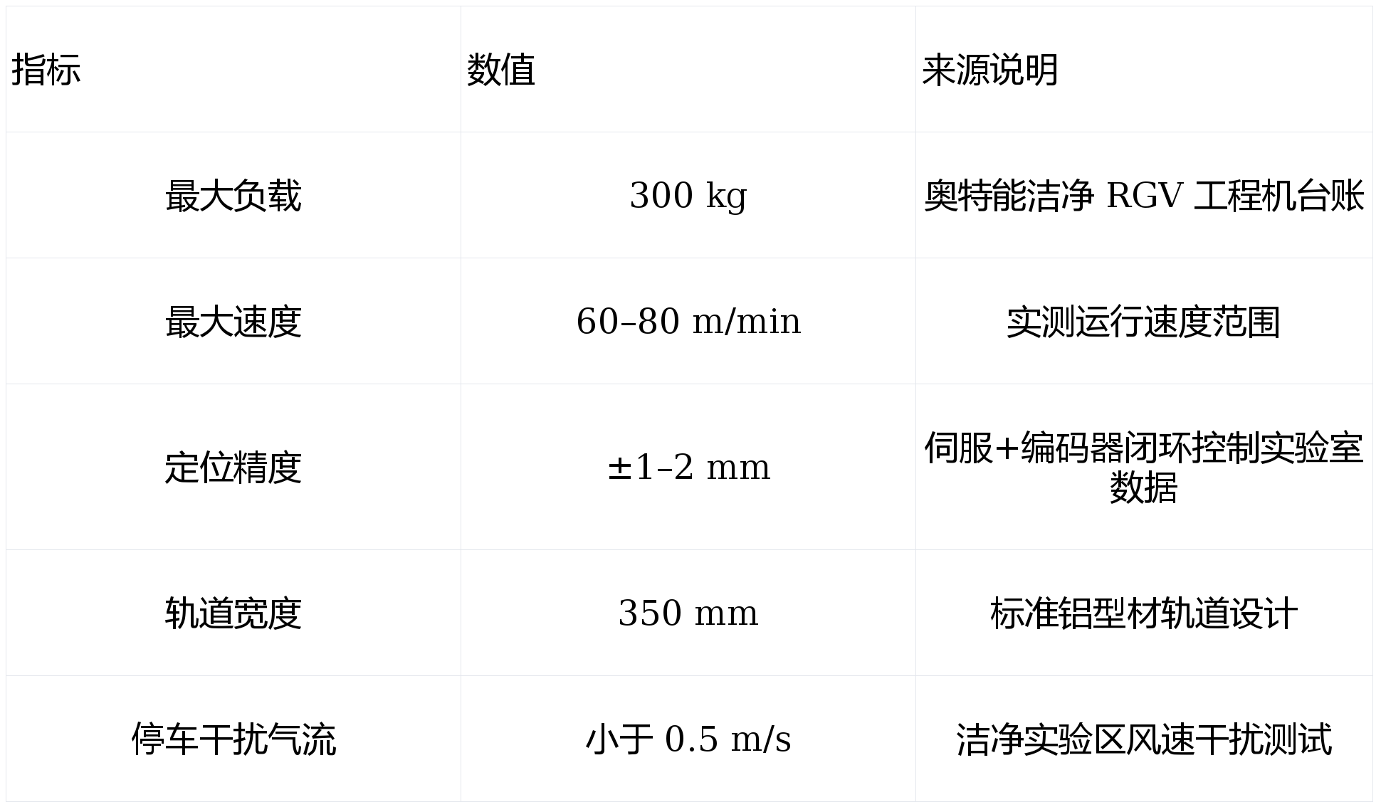 重量级参数示例(以常用洁净 RGV 型号为例)为保证数据的真实性,下列参数来自奥特能内部实际机型工程配置,可用于工程选型参考: