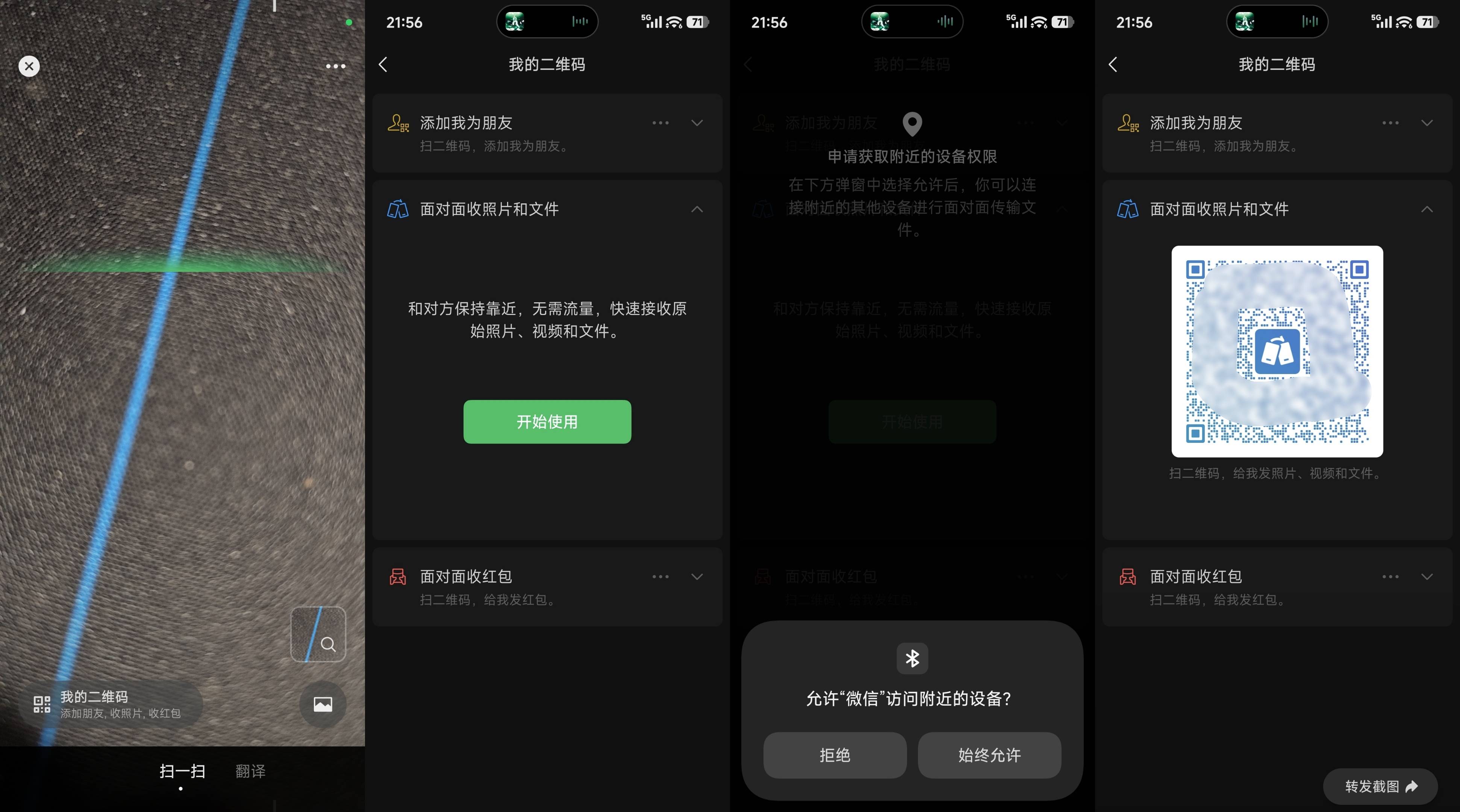 据我们观察发现,微信近期在扫一扫界面上线了一个「我的二维码」专区,进入后可以看到,除添加好友外,微信现还支持面对面收照片、文件以及红包🧧。
