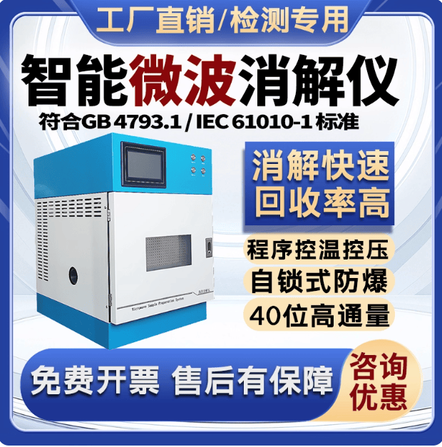 微波消解仪 1台 配置要求:①功率连续线性可调,微波频率2450HZ,炉腔采用316L不锈钢,内涂耐腐蚀涂层,炉门采用安全防爆装置,可以浮动释放压力,