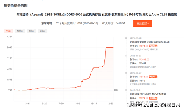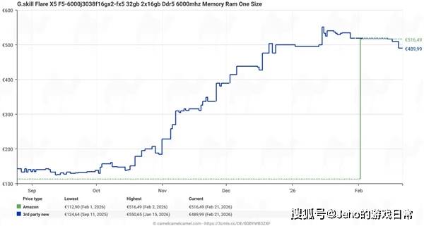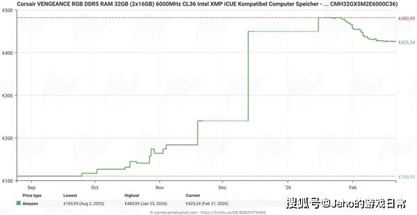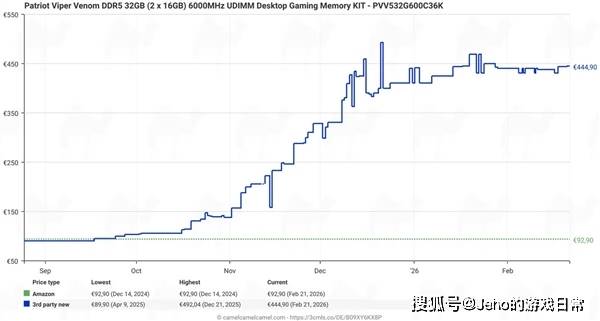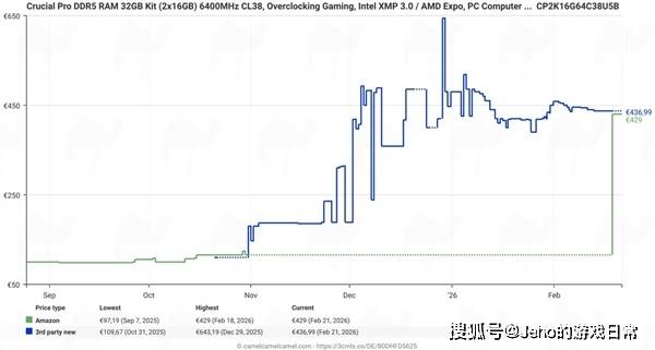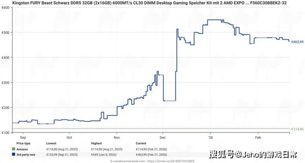但从2025年9月之后,情况彻底改变。这款内存套装的价格开始一路飙涨,涨幅十分明显,直到上个月,价格已经飙升至430-470欧元💶,较之前翻了四倍多。