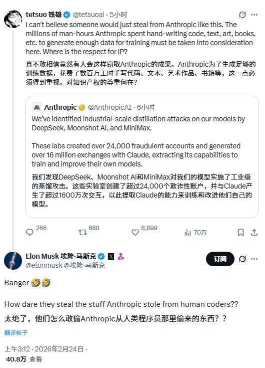 今日霍州注意到,创立 xAI 的埃隆 · 马斯克也发声评论,发推文称:“他们(中国)怎么敢偷 Anthropic 从人类程序员那里偷来的东西?”,指责该公司未经许可使用软件开发者的项目数据训练 AI。