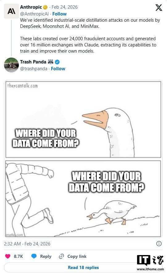 Anthropic 于当地时间周一表示,『DeepSeek』、月之暗面(Moonshot AI)和 MiniMax 背后的中国企业“创建了超过 2.4 万个虚假账号,与 Claude 产生了超 1600 万次交互,从中提取模型能力,用于训练和优化自家 AI 模型”。