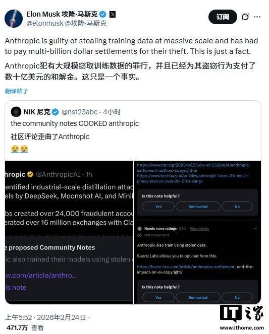 马斯克还称,“Anthropic 犯有大规模窃取训练数据的罪行,并且已经为其盗窃行为支付了数十亿美元💵的和解金。这只是一个事实。”对此有网友称,Grok 的训练数据也是偷窃的,马斯克回应称,“是啊,但我们不会像 Anthropic 那样对此表现得极度自鸣得意、伪善又虚伪。”
