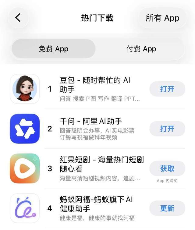 在用不完的AI新品、抢不完的AI红包🧧中,『互联网』用户注意力空前分散,又空前聚焦。他们在千问、『豆包』、元宝等通用AI助手之间来回跳转。如果没有例外,春节期间苹果App Store应用下载榜前五名几乎要被通用AI助手包揽。